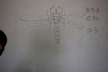上の写真のように、昆虫の体は大きく3つに分かれている(頭・胸・腹)こと。胸は詳しく観察すると、さらに3つに分かれており、真ん中の部分と腹側の部分から羽根が1枚ずつ生えていること。ダンゴムシのような多足類の脚の数が進化の中で減っていき、ちょうどよい6本が残っているのが昆虫だという説明には、なるほどと思いました。また、日本には3万種ほど昆虫がいること。世界では100万種がいることなどを教えていただきました。また、森にすむオオゴキブリの実物を持って来てくださり、子ども達に触らせてくれました。(家庭にいるゴキブリと違い、衛生的には問題ないそうです。)
