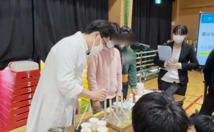 薬剤師コーナーでは、学校薬剤師さんが環境衛生のために、様々なことを検査していることをお話していただきました。また薬の飲み方については、良くない飲み方について実験をし、説明をしていただきました。