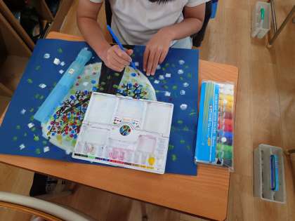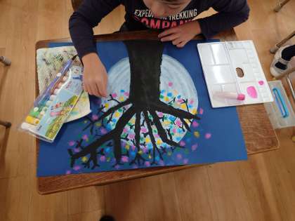 白い雪や雪に反射した光をスタンピングで上手に表現できていました♪
