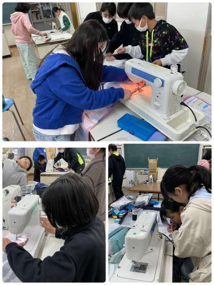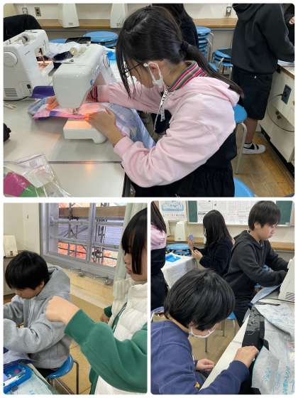 しつけ縫いをしたところを、ミシンで縫っていきました。時には友だちの力を借りながら、グループで協力して取り組んでいます!なかなかまっすぐミシンで縫うことは難しいようです。