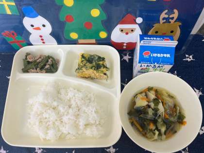 今日の給食の千草焼きは卵の中に、鶏肉、とうふ、コーン、みつばが入っています。