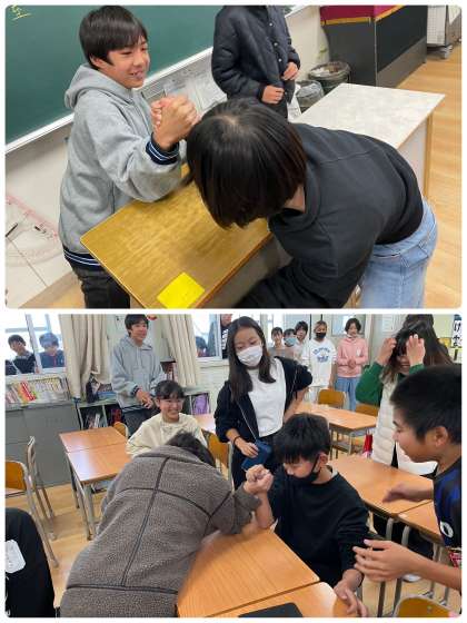 今日の昼休みにみんな遊びをしました。雨だったので、クラスで腕相撲大会を行いました!まず横の友だちと行い、次は近くの人とどんどん勝ち進んでいきました。みんなが応援する中、決勝戦が行われました。意外な人が強くて驚きの声もある中、楽しい時間を過ごすことができました。