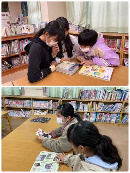 歴史や伝記、ミッケ、小説などそれぞれが好きな本を読んでいました。先生も混ざって、クイズ本を一緒に読み、問題を解いていました。なかなか難しくて苦戦しました。笑