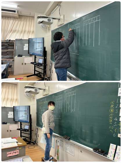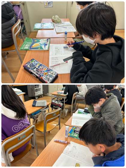 今日は、表につける丸の数が多いので、選ばないものに目をつけて考える方法も学習しました!バツだけつけていくとスムーズに答えを出すことができました!今日も前に出て、参加型で答えを発表してもらいました。冬休みが終わり、早速切り替えて勉強モードに入っている6年生です!頑張っています!えらい!