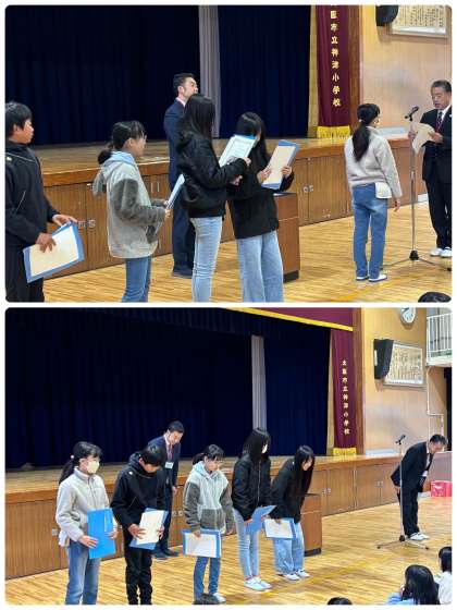 まず初めに、1学期に図画工作科で取り組んだ、国際平和ポスターで入選した5人の表彰がありました!それぞれが工夫をこらし、最後まで諦めずに取り組んだ作品なので、表彰してもらい嬉しく思います。表彰状にも自分の作品が載っていて、とても記念に残る作品になりました!