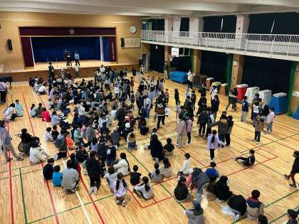 今日の児童集会は、「どちらが多いでしょう」をしました。お題に対して、自分の好きな方に移動します。「犬が好きか猫が好きか」や「算数が好きか国語が好きか」などのお題がありました。