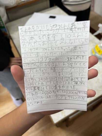 110番のかけ方を子ども達が実際にかけたつもりで説明してくださいました。住所は分かりますか?→わかりません。電話番号は分かりますか?→わかりません。…家の電話は逆探知できるから大丈夫ですよ、等です。