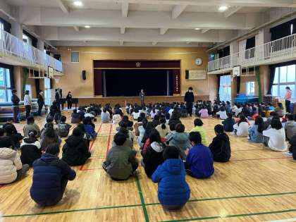 今日の全校朝会は、運動場の状態がよくなかったので、講堂で行いました。