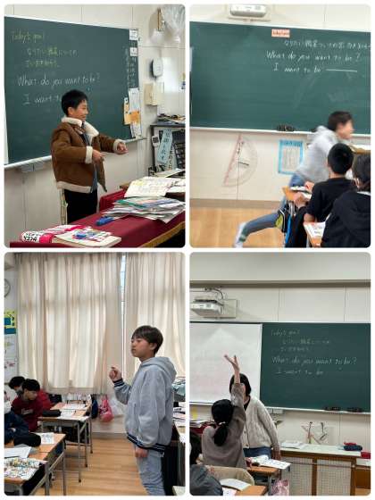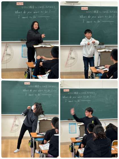 将来の夢について、発表する単元に入っています!今日は将来についてのことを伝える言い方を学習しました。What do you want to be?とI want to be...の言い方を覚えました。ジェスチャーゲームをして、どの職業のマネをしているかを当てました。1.2組ともとても盛り上がりました!外国語はゲームをしながら、学べることが多いのでいいですね!