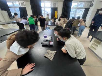 …白いもやもやが底から上へ行き、紫からピンク色に鮮やかに変化する様子を見て、おお〜?とあちこちから声が上がりました。