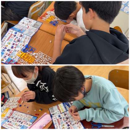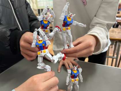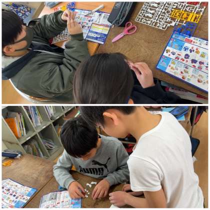 説明書をよく読み、友だちと協力しながら、全員がガンダムを完成させることができました。なんと、10分以内にできた子もいました!完成すると、「ジョイ」や「じゅげむ」などと名前をつけたり、色々なポーズにしてみたりと、楽しそうにしている様子が見られました。