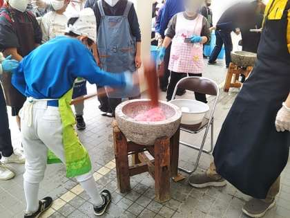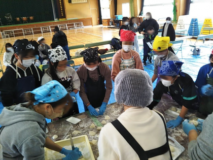 コロナ禍で長らくできなかった地域行事ですが、昨年に復活したお餅つき大会。6年生と地域や保護者がいっしょになって、ツイてコネて、みんなで丸めて、美味しくいただきました。みんな笑顔でとても和やかなお餅つき大会になりました。