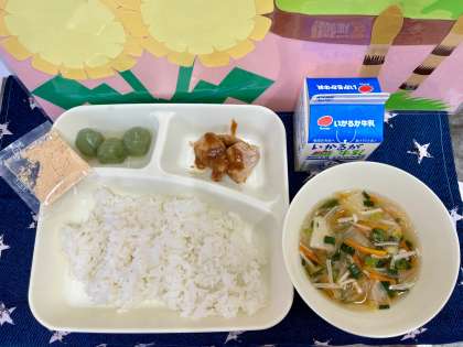 今日の給食のよもぎだんごは、うるち米ともち米、よもぎで作られています。甘いみつをからめたよもぎだんごに、きな粉をかけて食べます。