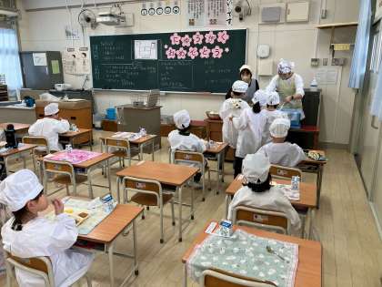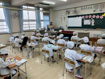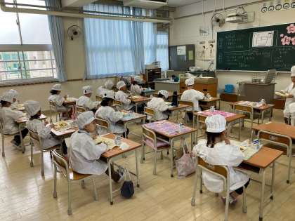 今日、小学校生活初めての給食でした。準備は6年生のお兄さん、お姉さんがお手伝いをしてくれました。とても美味しくて、おかわりをしていたお友だちもいました。