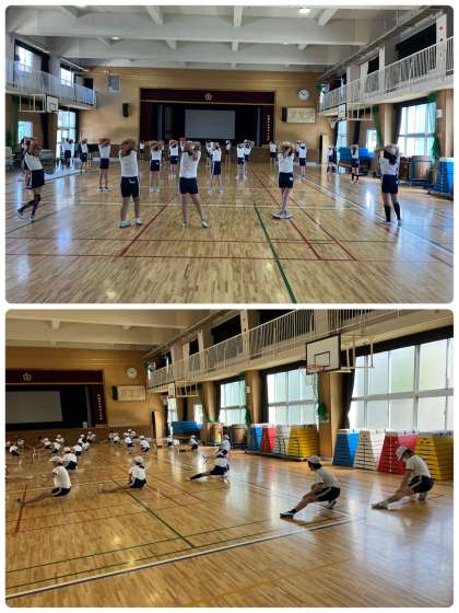 体育科の学習で準備体操をしています。大きな声でかけ声をかけていました。