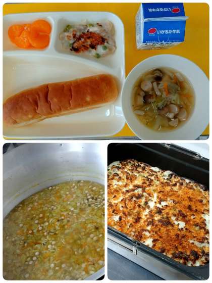 今日のマカロニグラタンは、鶏肉とたまねぎをいためたものにクリーム、小麦粉、牛乳、グリンピース、マカロニを加え、チーズとパン粉をふって焼いています。