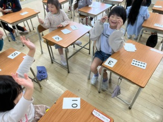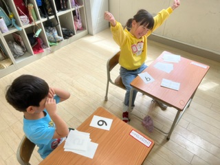 今日、算数の時間におおきさくらべをしました。数も10までならい、1から10まで数えられるようになったので、数カードと数図カードを使っておおきさくらべゲームをしました。「せーのっ」の掛け声で、カードを出し、自分の出したカードと相手のカードの数を読み、どちらの数が大きいかを比べました。「勝った」「負けた」「あいこ」だと言って楽しみながら、数を覚えることが出来ました。