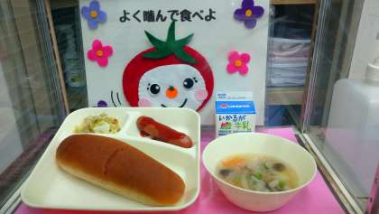今日の給食では、ゆでたウインナーソーセージにケチャップ味のソースをかけています。