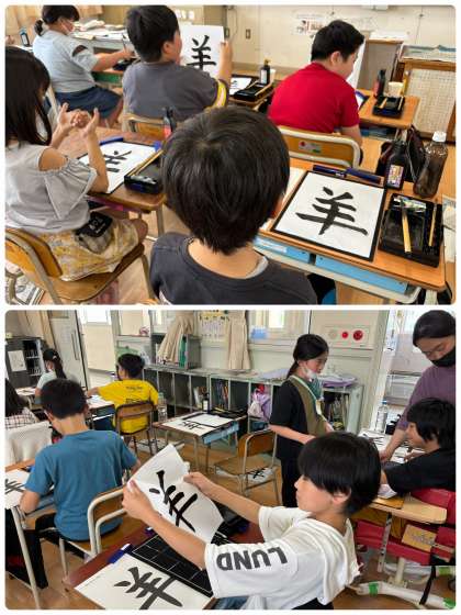今日は先週に学習した「羊」のまとめ書きの学習です。画や間隔に気をつけて書くというめあてを確認して、籠字をなぞってから清書を2枚書きました。2枚で納得いかなかった人だけもう1枚書きました。どっちがいいかなー?と悩んでる人がたくさんいました。先週の試し書きより、随分レベルが上がっていました。全員分掲示するのが楽しみです!