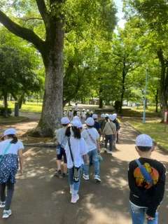 十三公園に校区たんけんに行きました。公園に行くまでの道で、止まれや通学路などの標識を見つけました。公園では、街灯やベンチ、遊具を見つけ、みんなの公園を掃除してくれている人がいることを知りました。