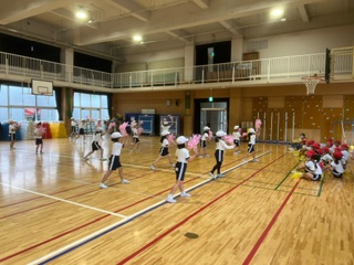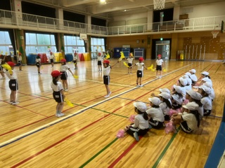 今日は、運動会のダンスを最初から最後まで通し、クラスで見せ合いっこをしました。入場と退場の流れを確認しながら自分の場所を覚えました。「大きく踊れていた。」「楽しそうに踊れていた。」など、見せ合いっこでお互いの良いところを見つけることができました。