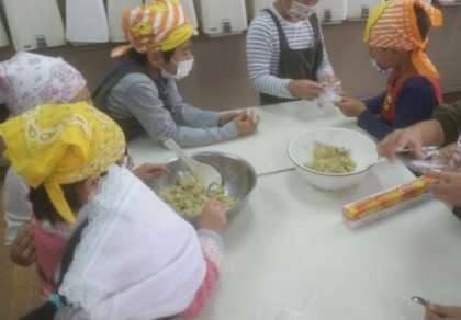 11月13日(金)の5時間目に、掘ったいもを使ってスイートポテトを作りました。 2年生全員で家庭科室に行って、まず、蒸かしたいもをつぶしました。砂糖とシロップを入れたいもは、まぜているだけでとてもいい匂いで「先生!早く食べたい!」と大盛り上がりでした。