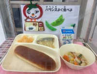 さんどまめとコーンのサラダ、黒糖パン、牛乳