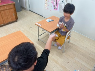 算数の時間に、かあどをつかってという学習をしました。計算カードを使って、まずは1人で「2+1は3」とカードを見て答えながら練習しました。その後、ペアで問題の出し合いをし、最後には、1+1から9+1までのカードを机に並べ、並べて気づいたことについて考えました。「階段になってる」「斜めにみると全部答えが同じだ」と気づくことができました!