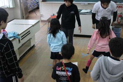 先生と足じゃんけん!縦割り班全員と先生の対戦です。勝率を競います。先生方も色々と知恵を絞っています。
