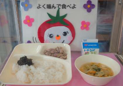 今日の給食には、さとうやしょうゆ、だし、しいたけを煮て、かつおぶしときざみのりを加えて煮つめた「のりのつくだ煮」が登場しました。