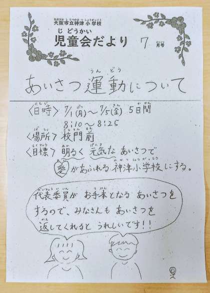 あいさつは、まわりの人とより良く関わっていこうとする気持ちや態度のあらわれで、あいさつ一言でまわりから信頼されたり、好ましく思われたりします。だから、あいさつは「自分からする」と決めて、進んでできるようになってほしいと思います。