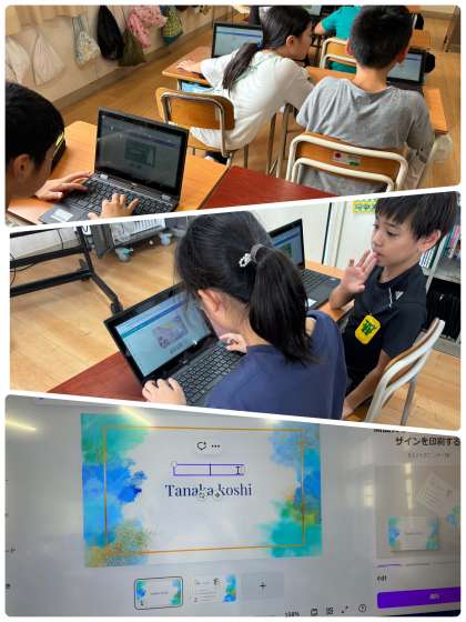 始まると夢中になって取り組んでいました。フォントを変えたり、素材を貼り付けたりして各々が素敵なデザインの名刺になりました。印刷ができたら友だちと交換したいと思います!お家にも持って帰りますので、ぜひ楽しみにしていてください!