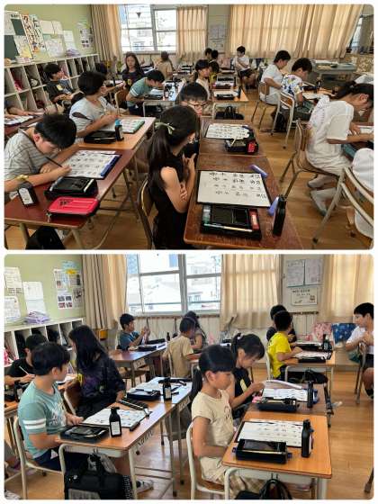 今日は、1学期から気になっていた毛筆で小筆を使って名前を書く練習をしました。