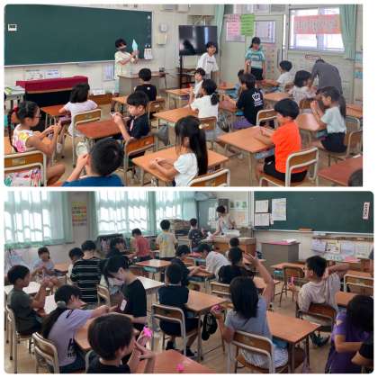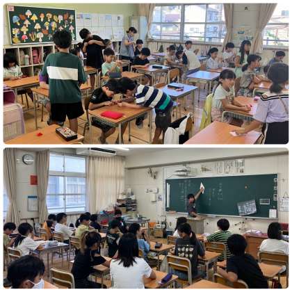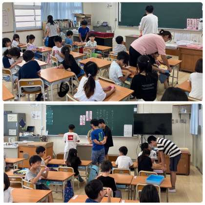 児童集会でお願いした千羽鶴作りに協力してもらうために、6年生が下学年の教室に行きました。この日に向け、折り鶴の練習を頑張ってきました。