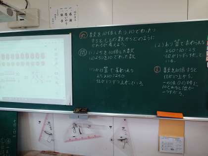 デジタル教材でお金を両替する様子から、10倍すると位が1つ上がり、10でわると位が一つずつさがることに気づくことができました!!
