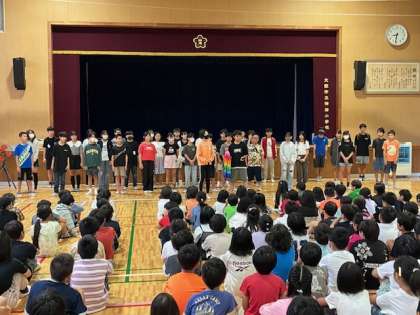 代表の児童が千羽鶴作成協力のお礼を言った後、みんなで「HEIWAの鐘」を合唱しました。2学期が始まってから一生懸命に練習してきた曲を、やっとみんなに披露することができました。最高学年として、全校児童に綺麗な歌声を届けてくれました。本当によく頑張りましたね。