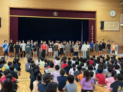 全校集会で、6年生が修学旅行行ってきます集会を開きました。