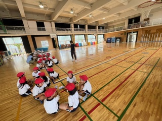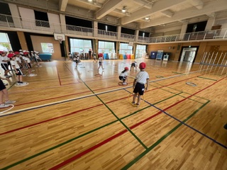 リレーあそびの学習をしました。今日は、5.6人で自分たちが走るコースを相談して作りをしました。輪っかの周りを回ったり体にくぐらせたり、棒をジャンプするなど色々な組み合わせでコースを作り、リレー遊びを楽しんでいました!