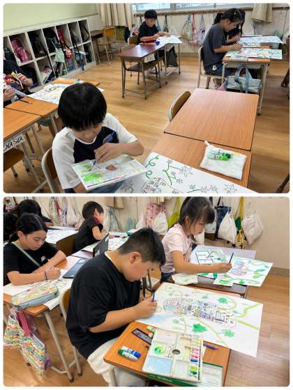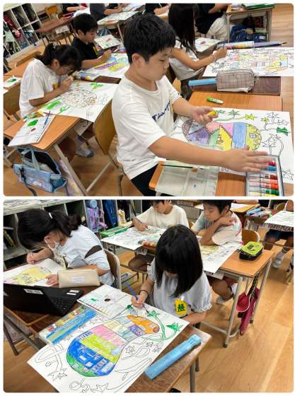 図工の作品「ヘチマンションとひょうたんハウス」の完成が見えてきました。もうほとんどの人が、ヘチマやひょうたんの葉っぱの色塗りに入っています!