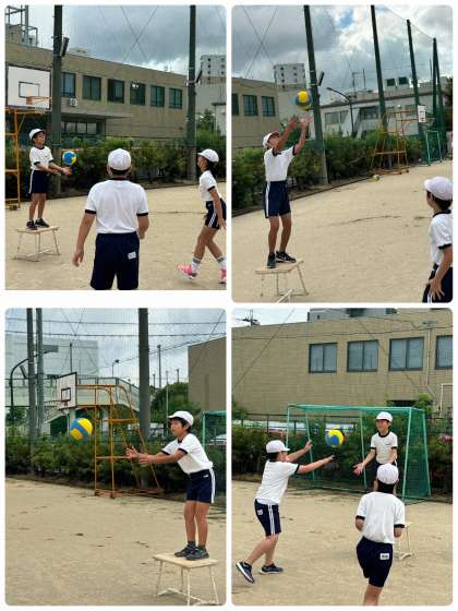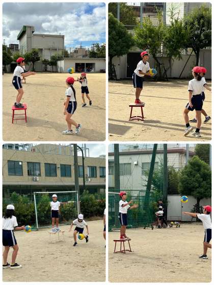 今日は、ポートボールの学習をしました。以前は、止まった状態のパスをしていましたが、今回は動きながらパスをつないで、ポートボール台にのっている友だちにパスをしてシュートする練習をしました!