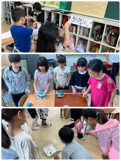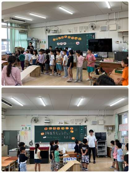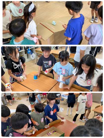 今日の2時間目に、2年生のお友だちが身の回りのもので作ったおもちゃで「おもちゃランド」をしました。今日は1年生のお友だちを招待して、1年生に遊んでもらいました。遊ぶ時はルールがあります。そのルール説明も2年生がしました。みんな楽しそうに遊んでいました。