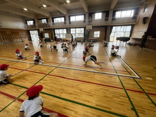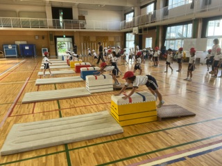 跳び箱の学習をしました。今日は、この前より遠くに手をつけるように練習しました。カエルジャンプをしたり、「トントン、ドン」と、ロイター板をドンの時に両足で踏めるようにしたり、色々な練習をしました。この調子で頑張って欲しいです!