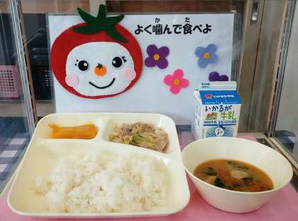 →今日の給食は、いわしだんごとだいこん、ごぼう、にんじん、みつばなどが入った汁物です。いわしだんごには、骨や歯をじょうぶにするカルシウムがふくまれています。