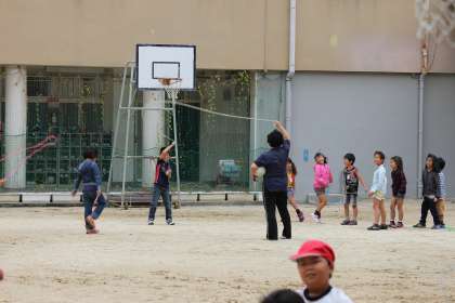 全校で15分休み(2時間目と3時間目の間10:30〜10:45)に、第1グラウンド(1〜3年生)と第2グラウンド(4〜6年生)に分かれて短縄や長縄に取り組んでいます。