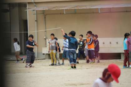 昨日は、あいにくのお天気で実施できませんでしたが、今日は晴れたので実施しました。心配していた台風もさほど接近せずに、安心しました。地面は少し湿っていましたが、子ども達は元気に先生や友だちと縄跳びを楽しんでいました。