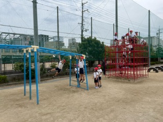 こていしせつあそびの学習をしました。ジャングルジムやのぼりぼう、うんてい、タイヤで登ったり跳んだりして、体全身を使って楽しむことができました!
