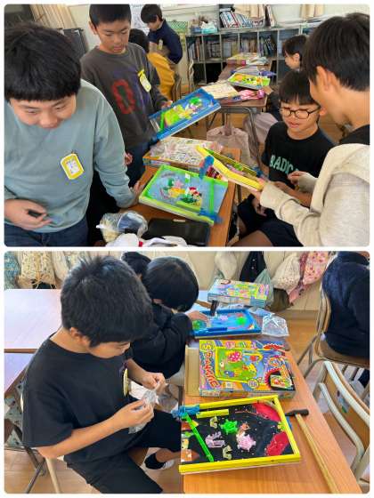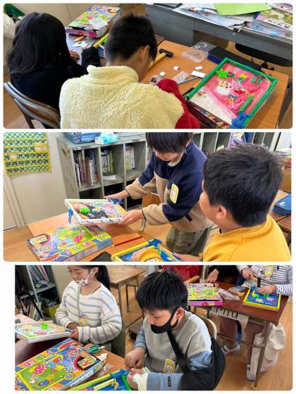 図工の学習で行ってきたコリントゲームの完成が間近になりました。釘打ちも上手になり、さまざまな部品を取り付けていきました。