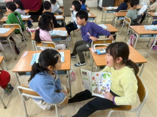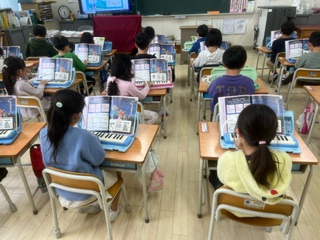 音楽で、歌や鍵盤ハーモニカの学習をしました。歌では、やまびこごっこの歌を新しく習い、ペアで「やっほー」というと「やっほー」とやまびこでかえすゲームをしました。鍵盤ハーモニカではきらきらぼしをみんなで練習しました。