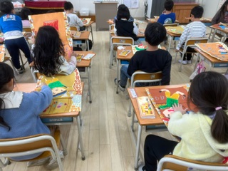 おむすびころりんの絵がついに完成しました。ねずみたちが踊ってるいる様子や餅を用意したりついたりしている様子、宝を隠している部屋など、子どもたちは色々な想像をしながら穴の中のねずみの家の様子を描きました!