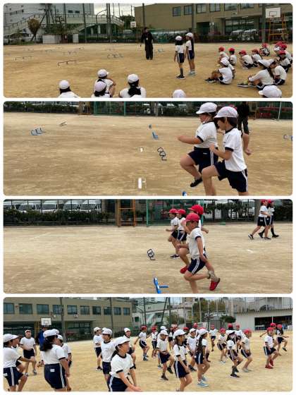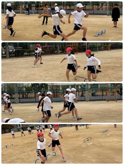 今日の体育の学習では、引き続きハードル走の学習をしています。4年生ではミニハードルを使用しています。0.1.2.3のリズムを意識してずっと練習してきました!